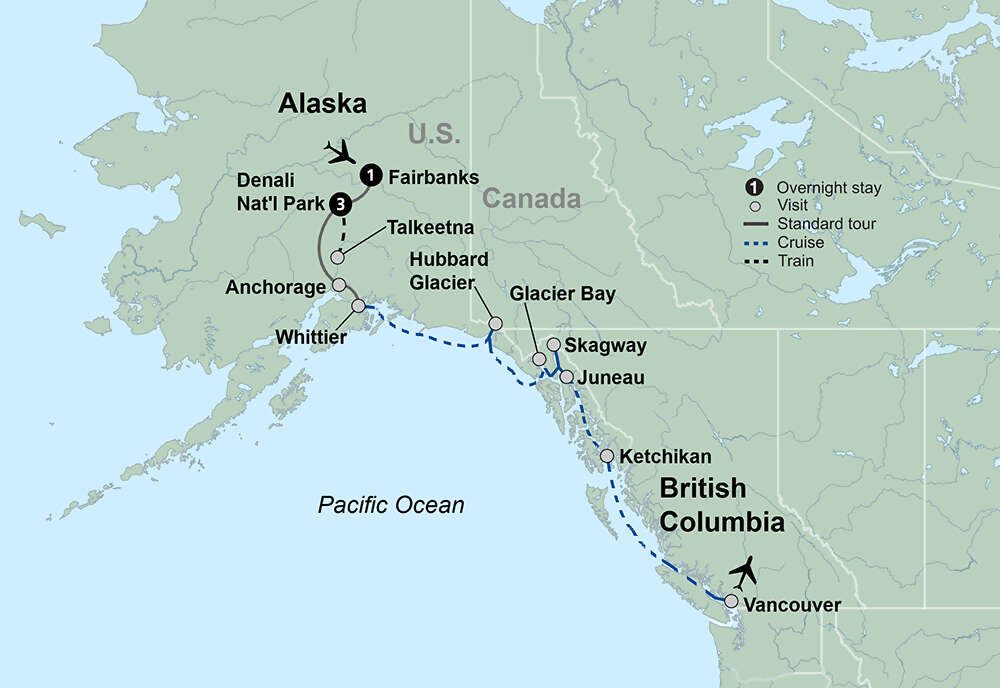 Traverse the Pacific coast by land and sea aboard one of Princess Cruise Lines’ lovely ships on a breathtaking journey that takes you from Alaska to Vancouver, British Columbia. Cruise the Sternwheeler Discovery and encounter Alaska’s diverse culture and rich history. In a modern saloon, enjoy local dishes inspired by Fannie Q, the famed Alaskan pioneer. Enjoy three nights at stunning Princess lodges and hotels. Ride a luxury domed railcar from Denali to Talkeetna, soak in views of the incredible landscapes from glass-ceiling railcars and open air observation platforms as guides provide expert commentary. Travel deep into Denali National Park for the best opportunities to view the region’s wildlife. Cruise through Glacier Bay and the Inside Passage, taking in rugged natural wonders. Explore Alaska’s gorgeous capital, Juneau. Visit Ketchikan, the “Salmon Capital of the World.” This is Alaska as you always imagined.