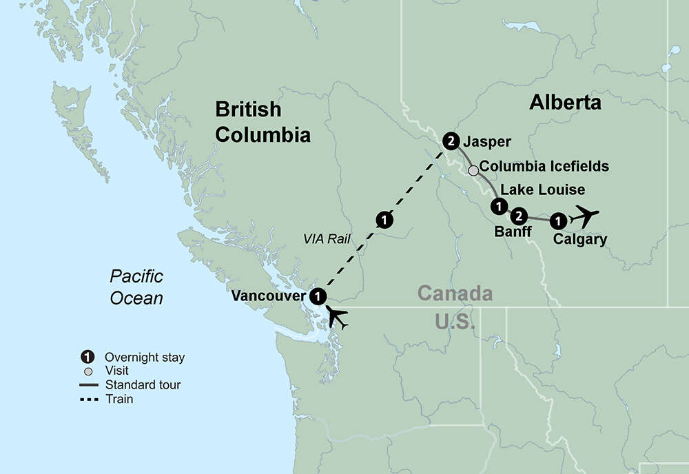 From the lush green Pacific coast of Vancouver, board VIA Rail’s The Canadian for a once-in-a-lifetime overnight train journey. Relax in the dome car and experience panoramic views of snow-capped mountains, glacial lakes, rushing rivers and the sheer unspoiled wilderness of Canada. Arrive in Jasper and see the dramatic Maligne Canyon and its picture-perfect lake. Journey along the unforgettable Icefields Parkway. Marvel at Athabasca. Feel like royalty while overnighting at the fabulous Fairmont Chateau Lake Louise and Fairmont Banff Springs. Discover the natural beauty of Moraine Lake and the powerful Bow Falls. Experience a day on a ranch in the Alberta plains, complete with a wagon ride in search of buffalo and a BBQ lunch in the great outdoors. End your journey in cosmopolitan Calgary. Discover the natural beauty only found in the Canadian Rockies.