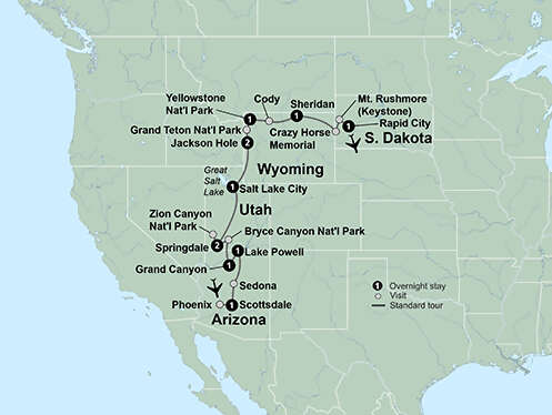Experience the grandeur of the American West as you explore five fantastic national parks on this exciting journey. In Yellowstone, relish iconic sights like Old Faithful and Yellowstone Lake, and in Arizona, contemplate the vast beauty of the Grand Canyon. Enjoy a breakfast cruise on Lake Powell. Enjoy 2-night stays in Springdale, Utah (Zion) and Jackson Hole. Marvel at the magnitude and color of Zion’s cliffs and the hoodoos and spires at Bryce Canyon. Drive through the incredible Bighorn Mountains and the great Sioux Nations Territory before seeing Mt. Rushmore and Crazy Horse Monument. Meet a local Lakota Native American at dinner and learn about their fascinating way of life, past and present. Gain new appreciation of the great outdoors on this journey that takes you from the Grand Canyon to Mount Rushmore National Memorial and everywhere in between.